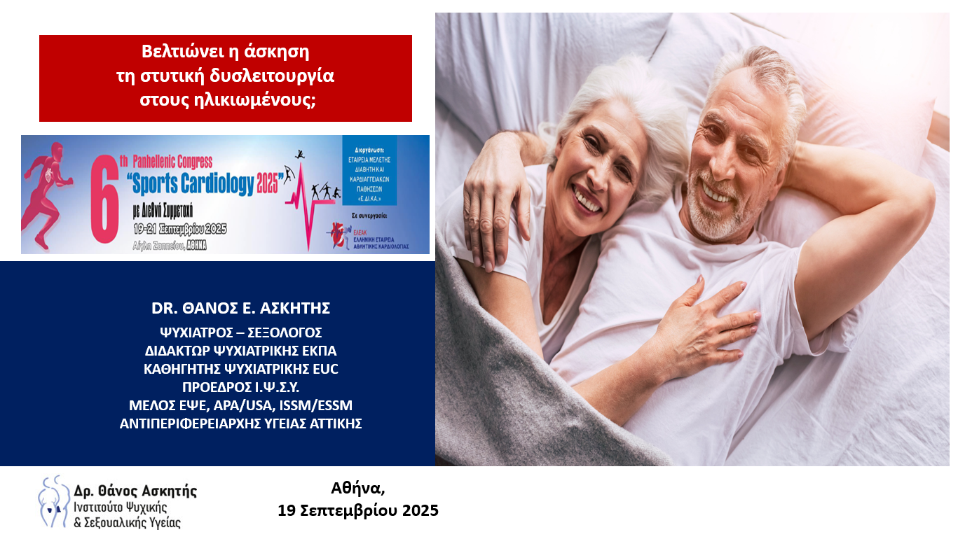 Στο πλαίσιο του 6ου Πανελλήνιου Καρδιολογικού Συνεδρίου «Sports Cardiology 2025», πραγματοποιήθηκε στην Αίγλη Ζαππείου, η ομιλία του Καθηγητή Ψυχιατρικής και Σεξολόγου Δρς. Θάνου Ασκητή με θέμα: «Βελτιώνει η άσκηση τη στυτική δυσλειτουργία στους ηλικιωμένους;».